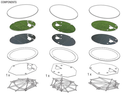 This new circular gathering space emerges from the ground in a series of eleven green bamboo shading vaults, organized in two rings around a void. The plan is inspired by the rings of a tree, and the different form of the vaults by growth patterns in nature. In the same way that the infinite variety of shapes in a tree emerge from very simple branching rules, the configuration of vault shapes uses a single geometry, the parabolic arch, in a way that could in theory generate endless configurations.
